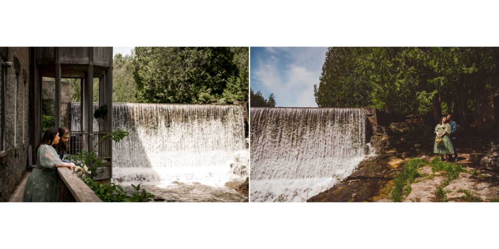 Historic Architecture: The rustic exteriors of the stone mill and the charming wooden structures around the property serve as unique backdrops that contrast beautifully against delicate, flowy wedding attire.