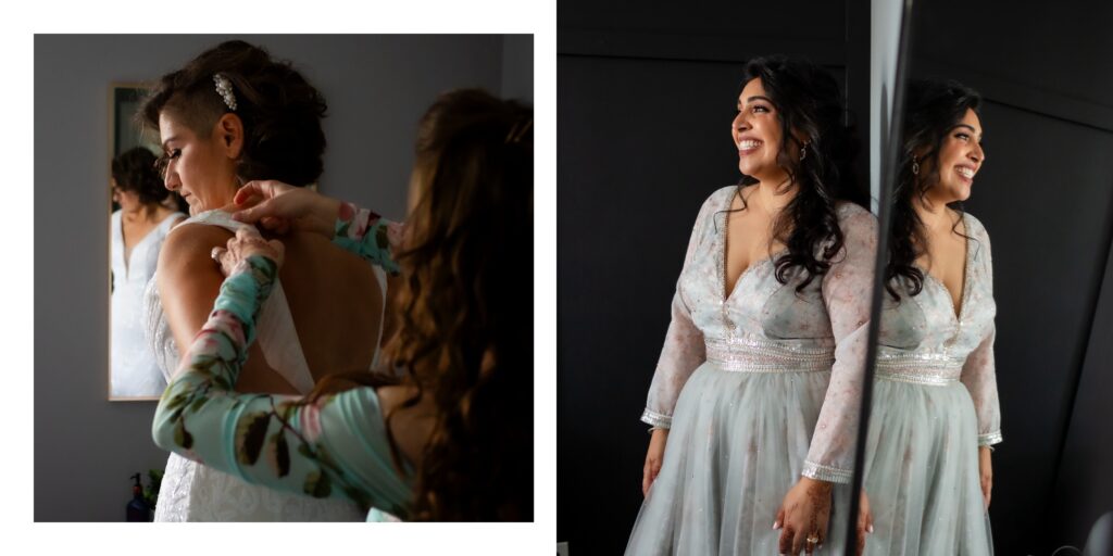 The day began with the pair getting ready at home, surrounded by love and laughter. This small setting allowed them to spend quiet minutes together before the excitement of the day began. These authentic moments are vital for wedding photos. Photographing the couple’s interactions, such as shared chuckles, consoling hugs, or moments of reflection, adds dimension to the wedding album.
