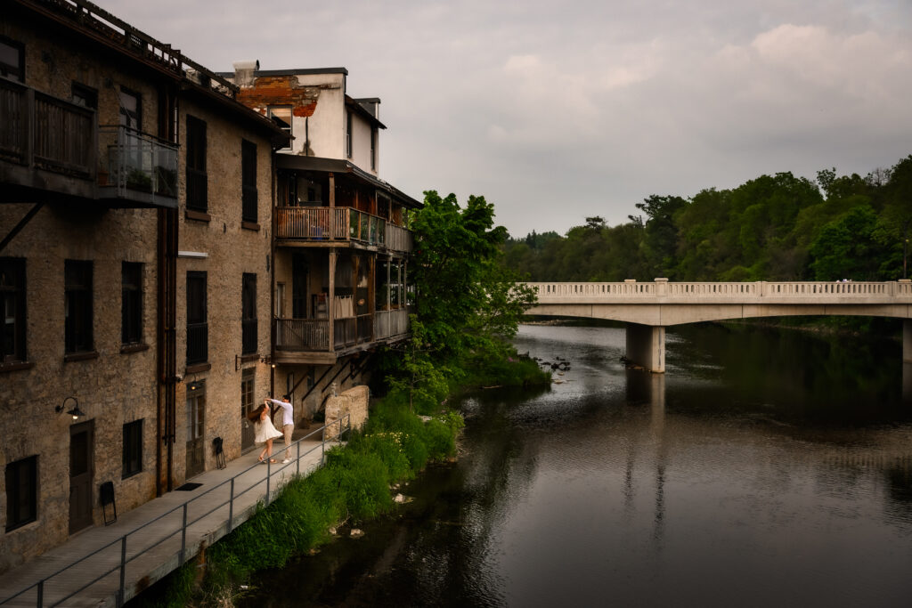 Perched dramatically above the rushing waters of the Grand River, this beautifully restored 19th-century mill is now a luxurious boutique hotel—and one of the most iconic landmarks in the town. The stone façade, elegant interiors, and scenic views from the terrace make it a standout spot for engagement photos. Couples often take photos on the pedestrian bridge nearby, with the Elora Mill and waterfalls in the background. It’s pure magic.